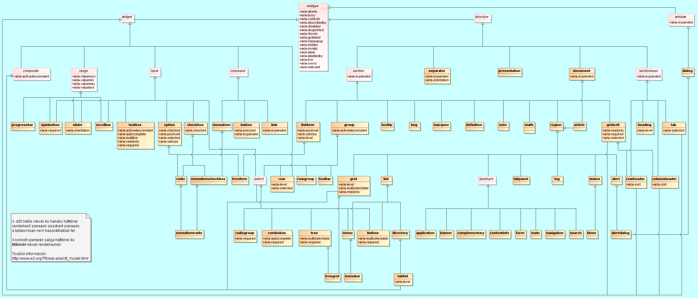 A szerep taxonómia interakciós widgeteket és dokumentumstruktúrát kifejező elemeket tartalmaz. A taxonómia meghatározza az öröklődést és részletezi az egyes szerepek által támogatott attribútumokat. További információt a szerepek leképezéséről az akadálymentességi API-kra a WAI-ARIA Felhasználói Alkalmazás Implementációs Útmutató [ARIA-IMPLEMENTATION]-ban találhat.